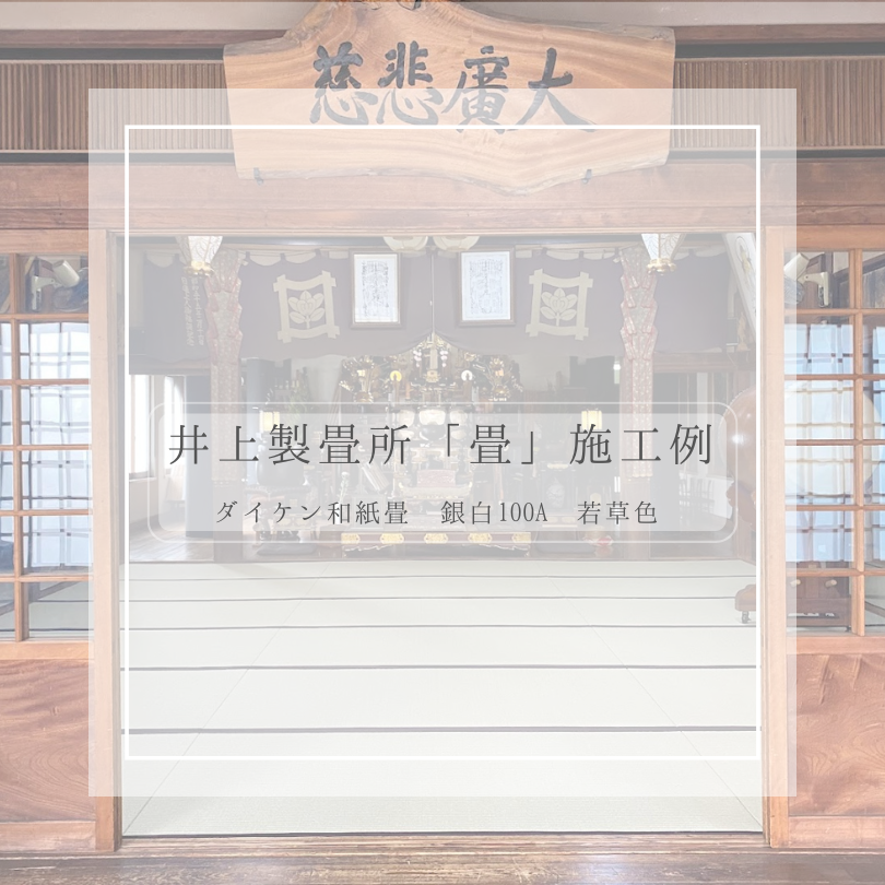 ○ ダイケン和紙畳 表替 畳表 : 「銀白100A 若草色」 畳縁 : 御座縁・茶色 厚み : 55o 本堂 十八畳間 表替 本間サイズ(幅90p以上) 価格 : 10,000円×18帖 180,000円 (税込 二畳台 特注品