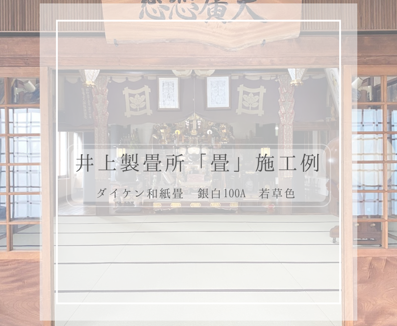 ○ ダイケン和紙畳 表替 畳表 : 「銀白100A 若草色」 畳縁 : 御座縁・茶色 厚み : 55o 本堂 十八畳間 表替 本間サイズ(幅90p以上) 価格 : 10,000円×18帖 180,000円 (税込 二畳台 特注品