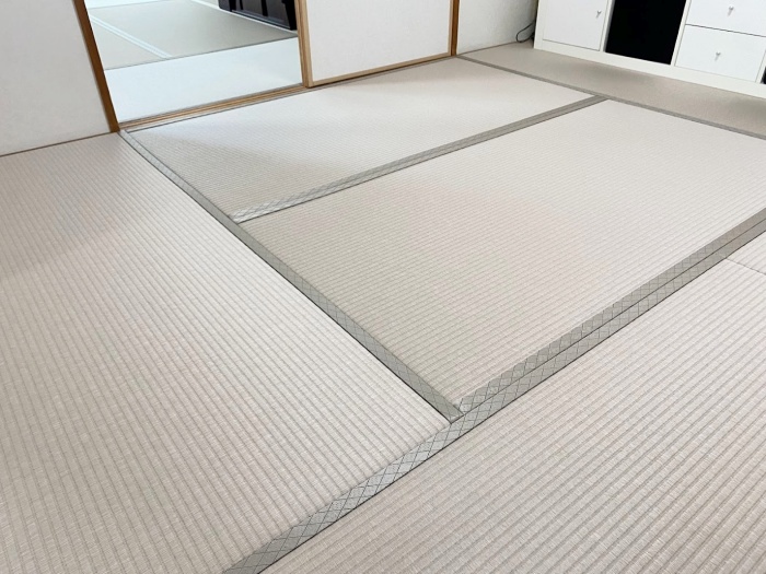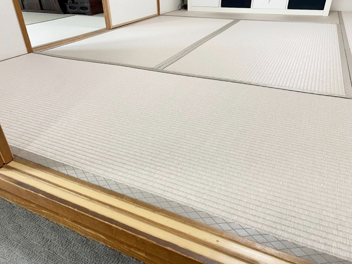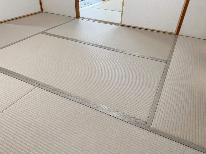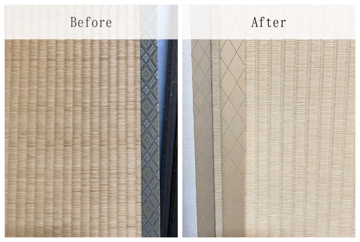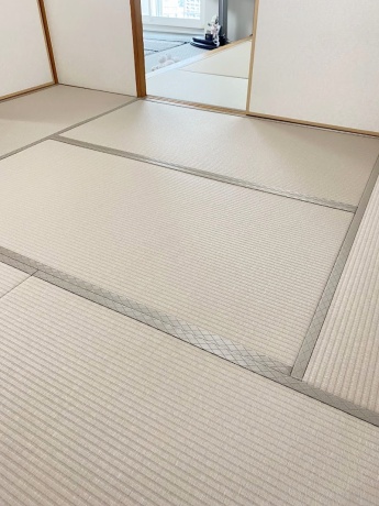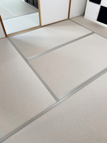 ○ ダイケン和紙畳 畳表 : 「銀白 カラー 灰桜色」 畳縁 : オールウェイズ No22 (高田織物) 畳床 : ダイケン畳床 厚み : 55o 六畳間+六畳間 表替 価格 : 10,500円×12帖 126,000円 (税込)