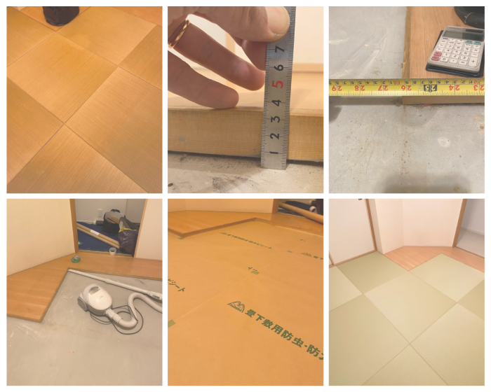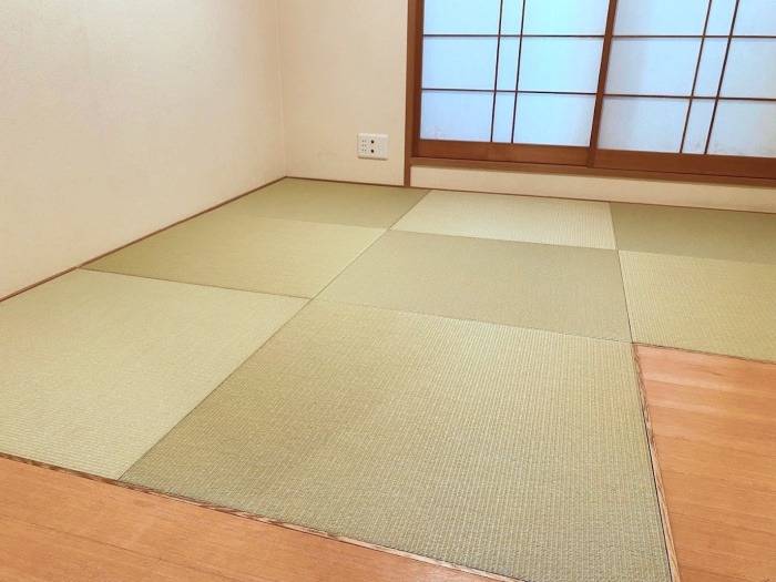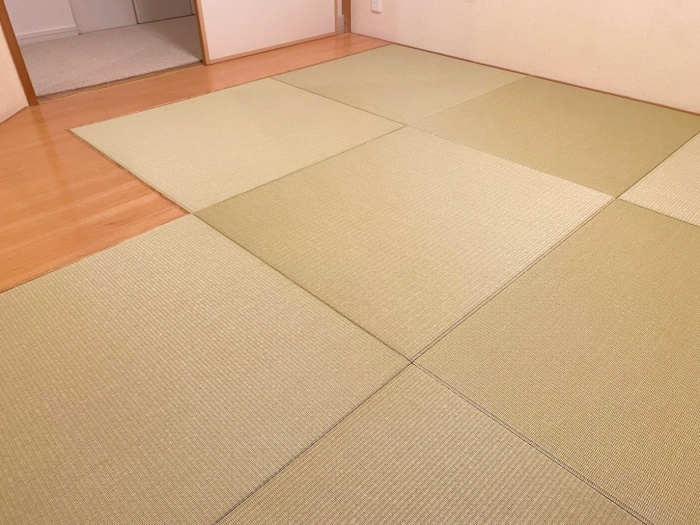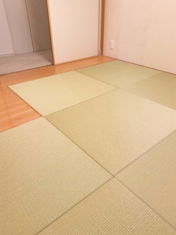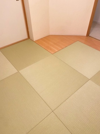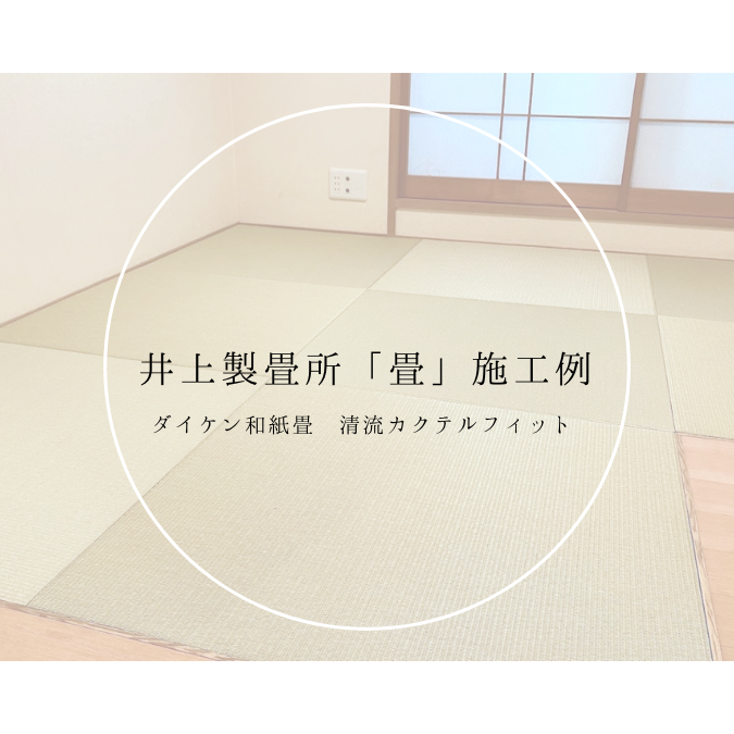 ○ ダイケン和紙畳 琉球畳 畳表 : 「清流 カクテルフィット No21」 (銀白色×若草色のミックス表) 畳床 : ダイケン型畳床 厚み : 32o 変形四畳半間 新調 価格 : 11,500円×8帖 92,000円(税込)